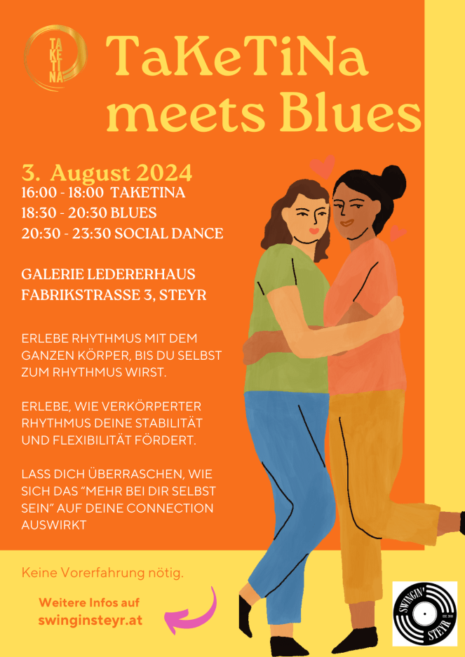 Schöne Lernerfahrungen bietet der Sommerworkshop Taketina meets Blues am 3. August ab 16.00 Uhr im Ledererhaus in Steyr. Bei Schönwetter kann vorher in der Steyr gebadet werden und danach sorgt unser erstes Blues-Social für einen stimmungsvollen Ausklang.