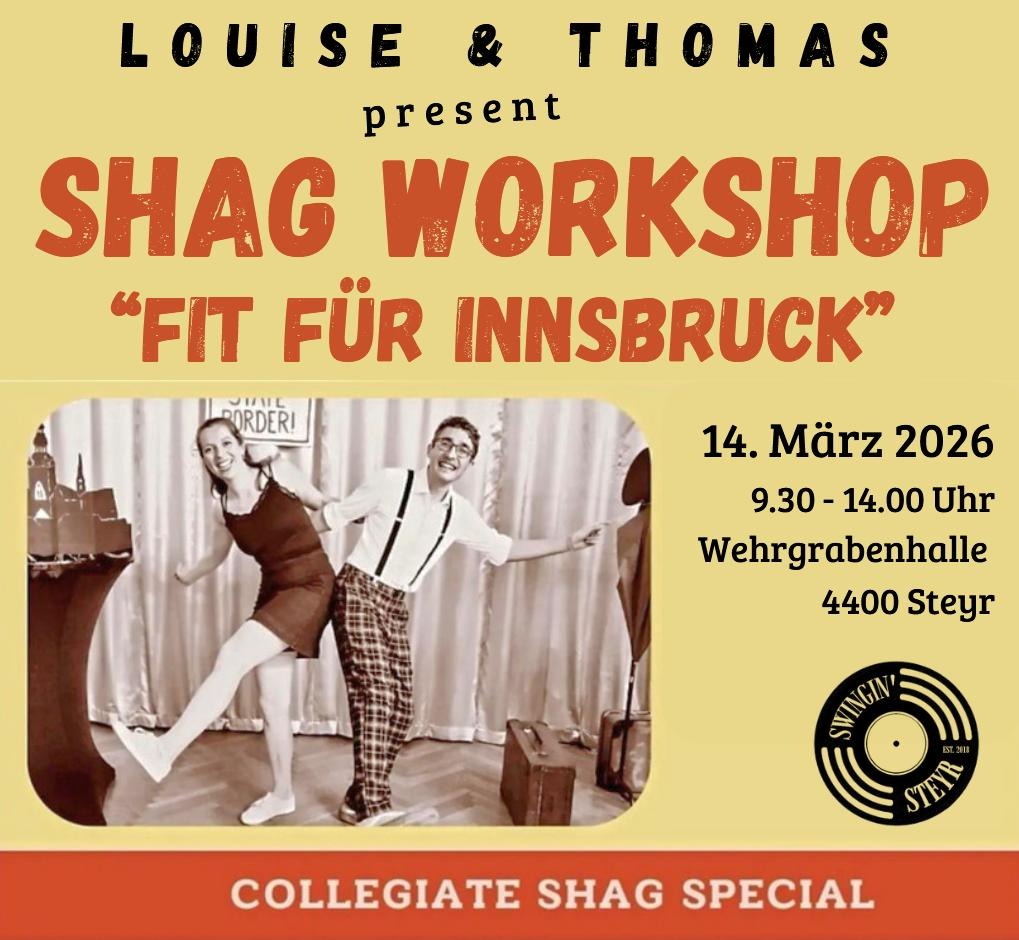 Unter dem Titel „Fit für Innsbruck“ – ist ein weiterer Shag-Tag mit Louise & Thomas am Samstag, den 14. März von 9.30 – 14.00 Uhr in der Wehrgrabenhalle, Wehrgrabengasse 22, 4400 Steyr